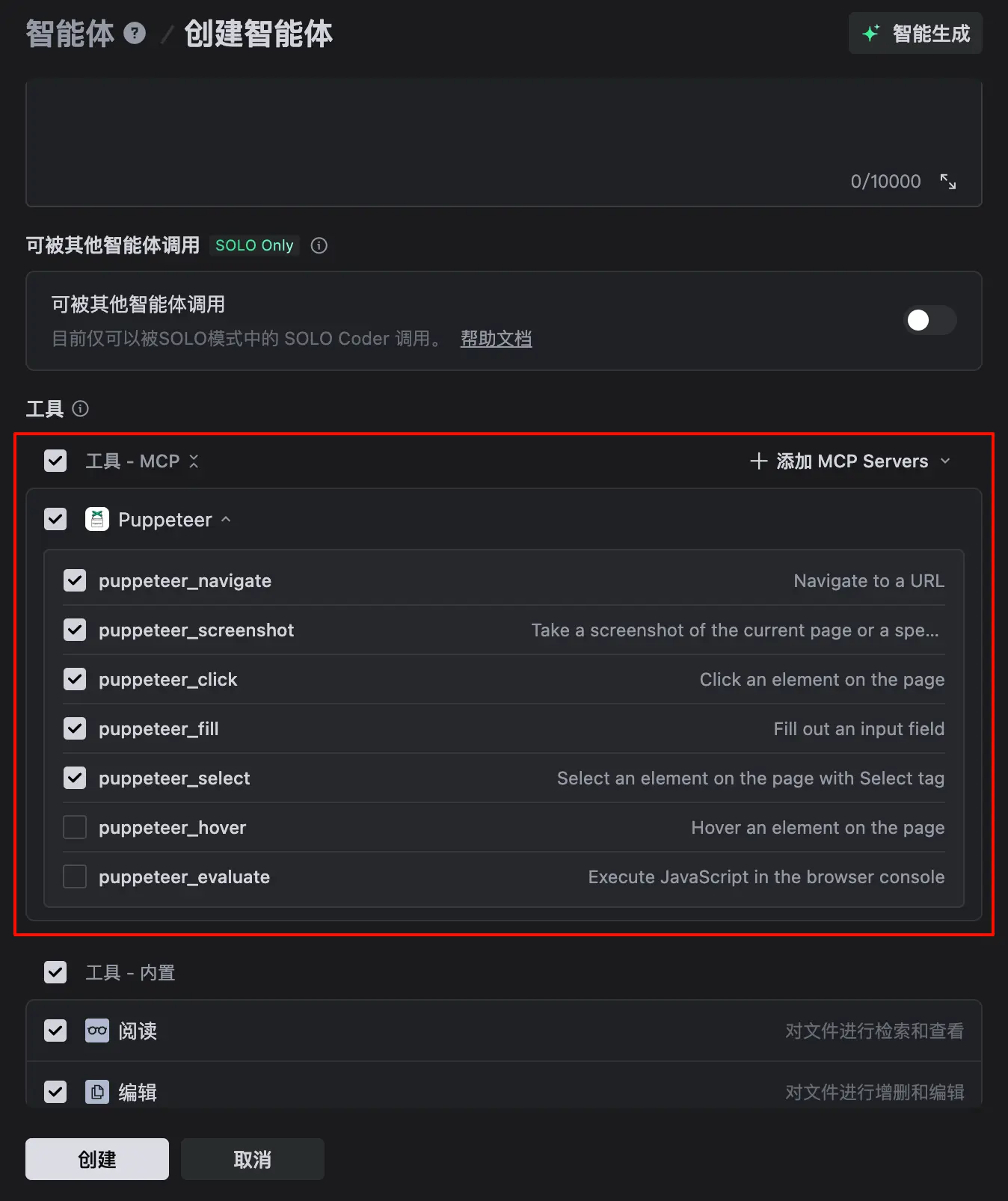 在 创建智能体 面板的 工具 - MCP 部分,勾选需被其调用的 MCP Server 以及 MCP Server 中的工具。