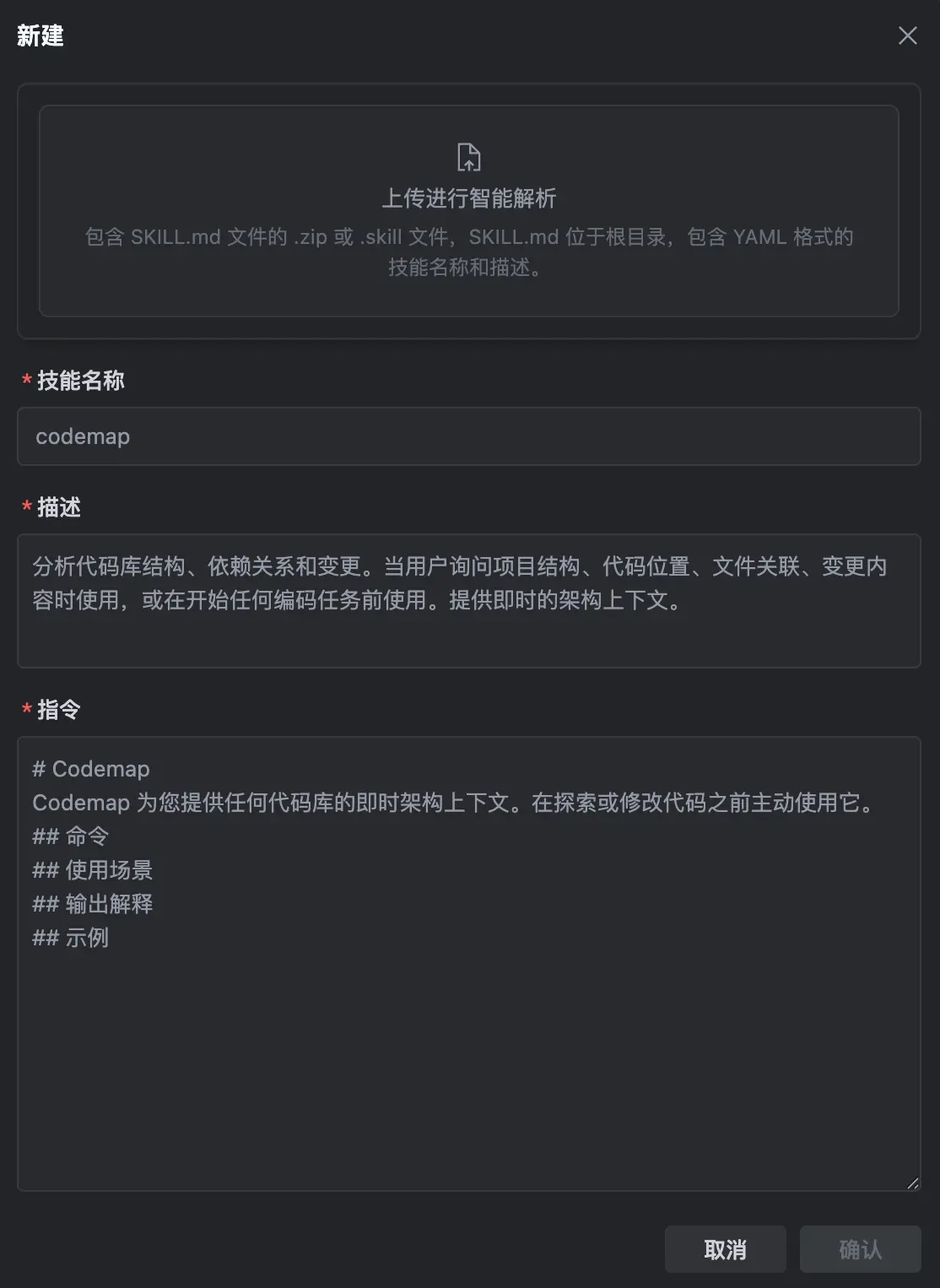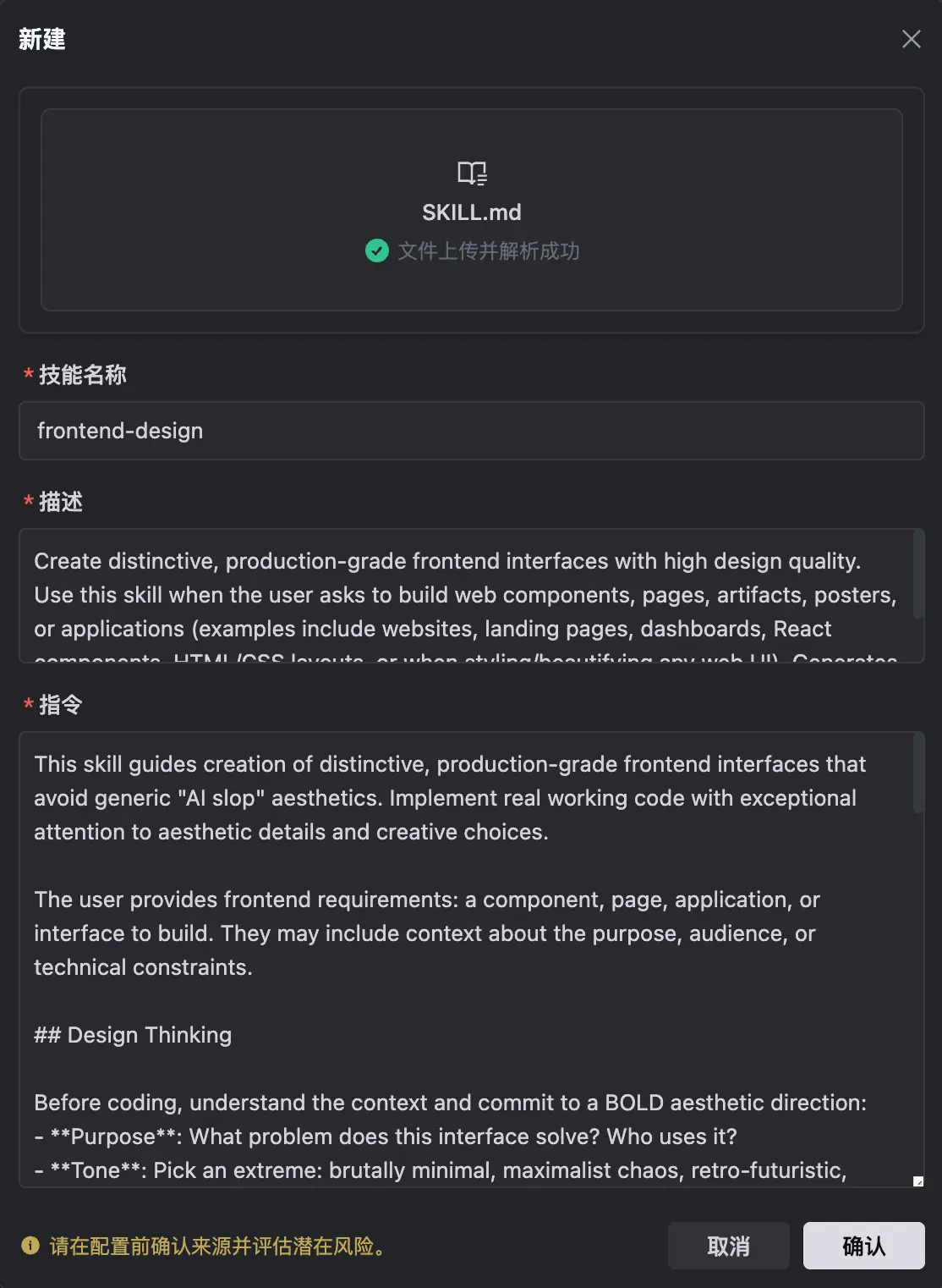 - 按需修改 技能名称 、描述 和 指令 字段中的内容,然后点击 确认 按钮。