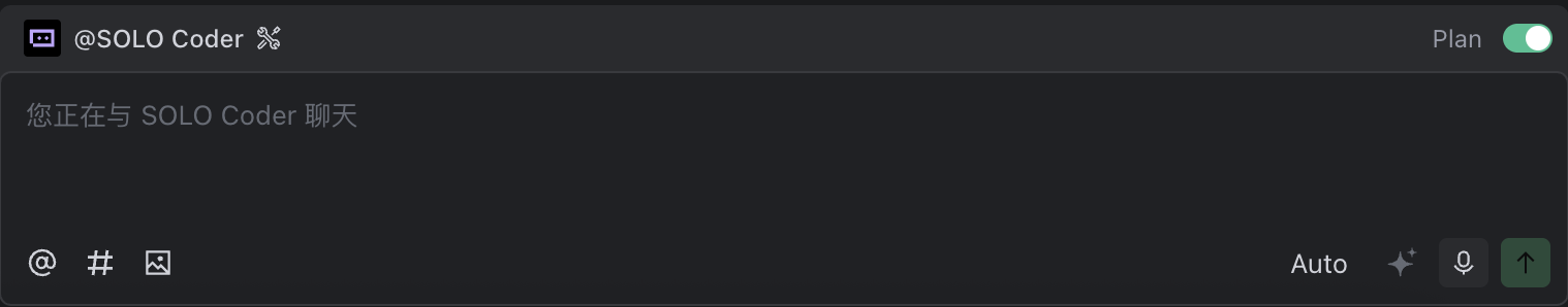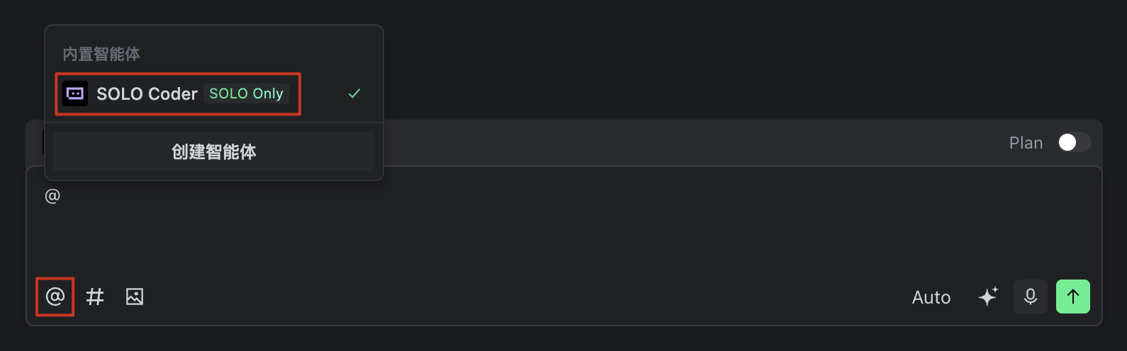 进入 SOLO 模式后,点击 AI 对话输入框左下角的 @ 符号,然后在智能体菜单中选择 SOLO Coder。