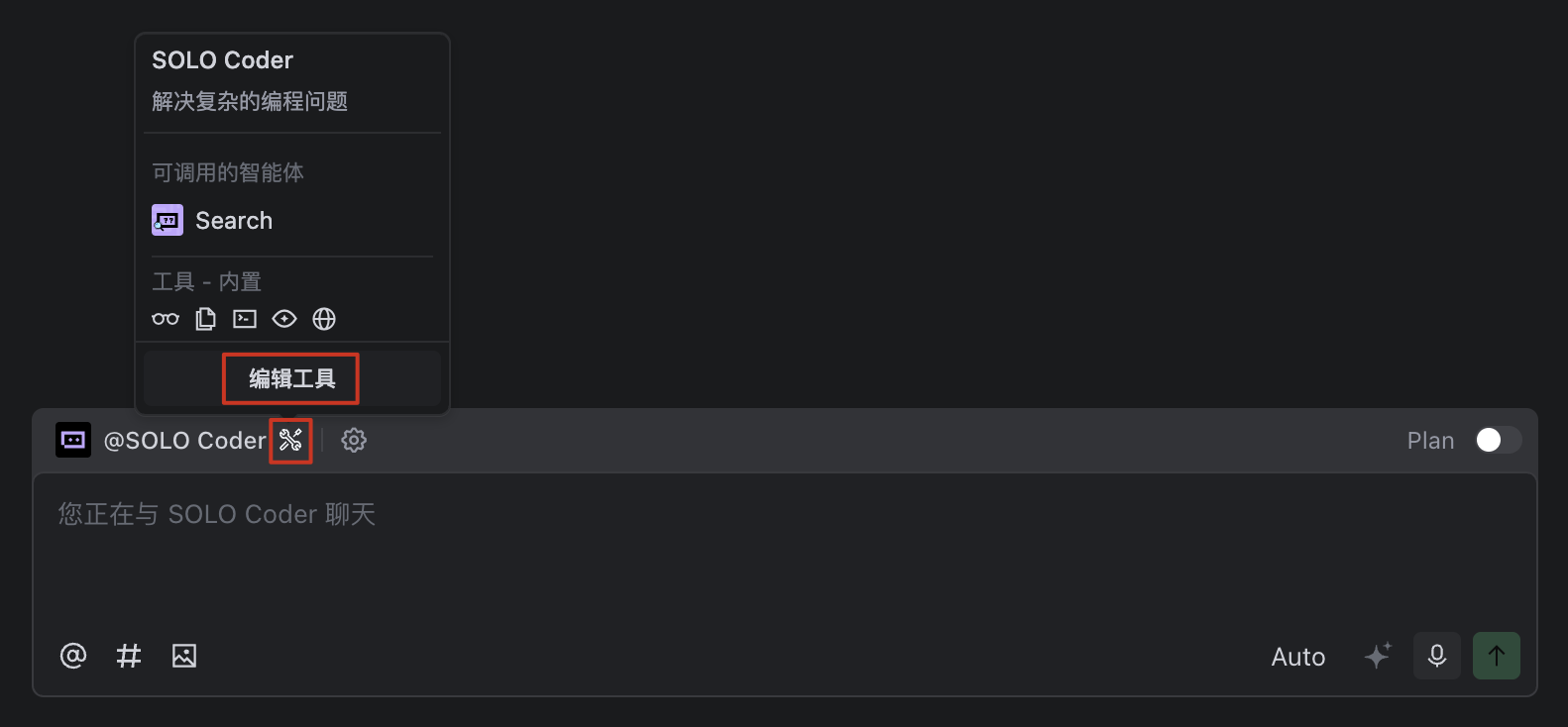 将鼠标悬浮至配置图标,然后点击面板上的 编辑工具 按钮,前往 SOLO Coder 的配置面板。