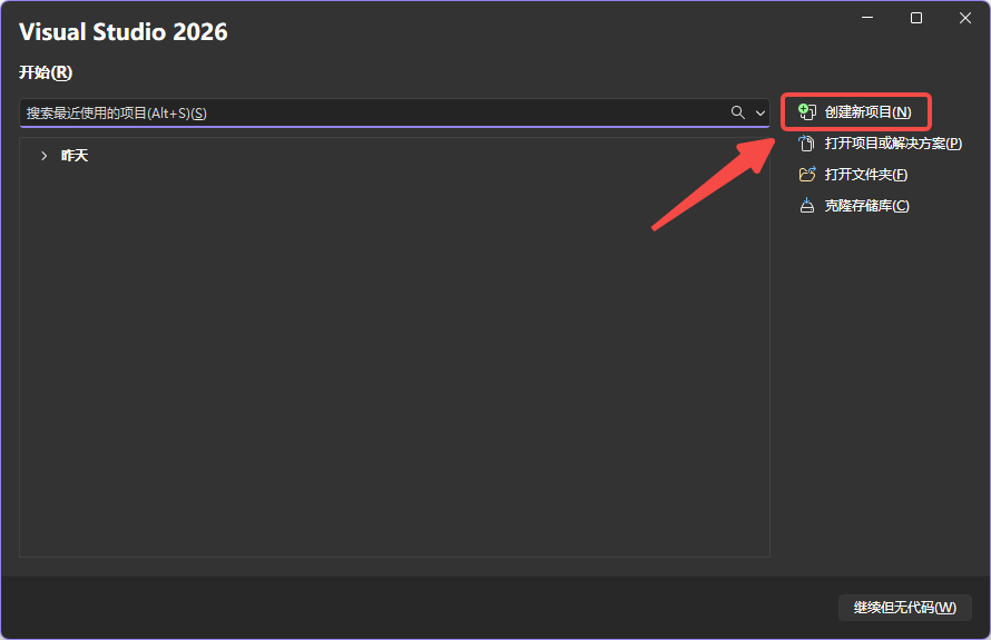 打开 Visual Studio ,点击 创建新项目。