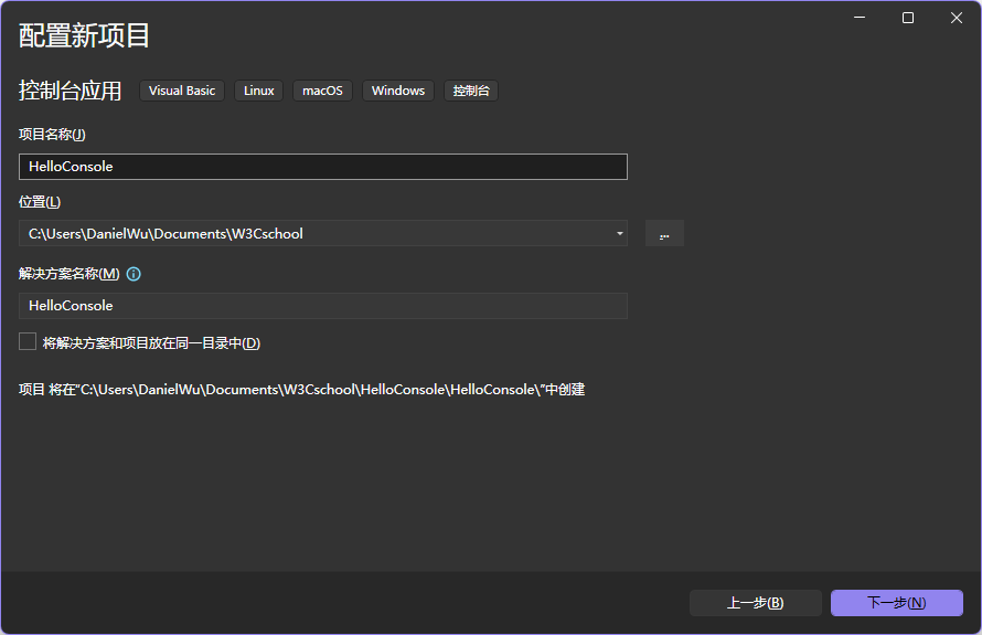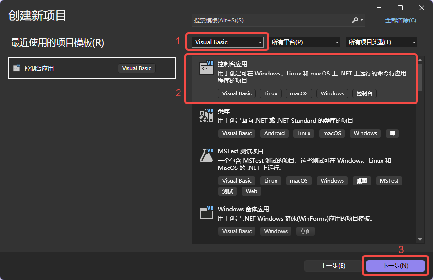 选择语言 Visual Studio ,选中 控制台应用 ,点击 下一步 。