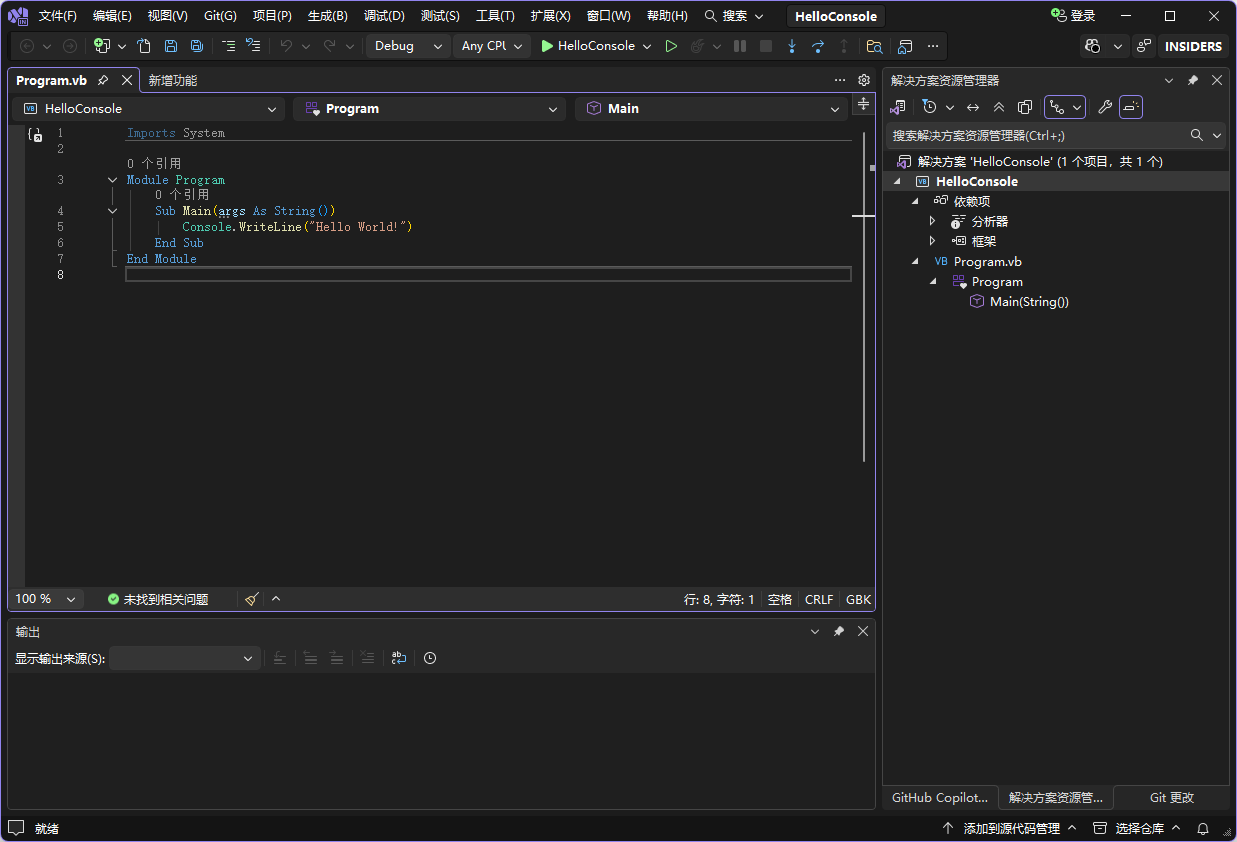 如下图,Visual Studio 2026 已经默认预置了 Hello World 程序 代码,如没有可以复制以下代码,黏贴至 Program.vb 中