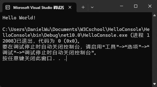 按下 F5 ,即可在终端中输出 Hello World!