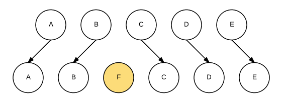 这时如果每个节点都没有唯一的标识,React无法识别每一个节点,那么更新过程会很低效,即,将C更新成F,D更新成C,E更新成D,最后再插入一个E节点。效果如下图所示: