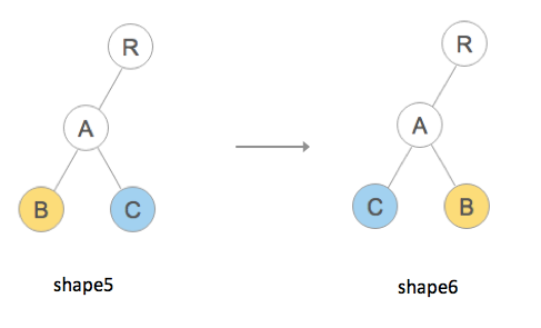 对于列表节点顺序的调整其实也类似于插入或删除,下面结合示例代码我们看下其转换的过程。仍然使用前面提到的示例:https://supnate.github.io/react-dom-diff/index.html ,我们将树的形态从shape5转换到shape6: